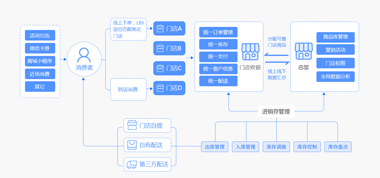 线下实体门店与线上商城同步销售,线上线下统一管理。