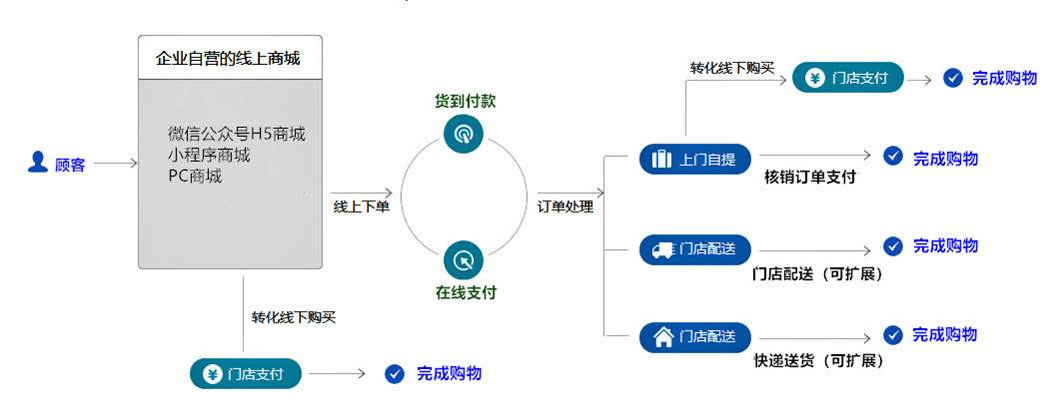 顾客在线上商城自由下单,根据LBS定位可以推荐和建议附近门店提货,顾客到门店出示会员码,扫描核对,大大缩减取货流程。